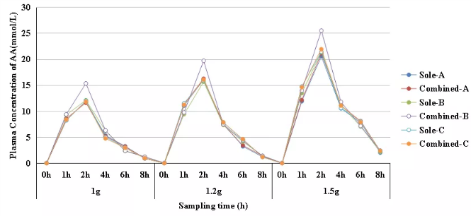 VitC抗肿瘤的研究始于70年代,两届诺贝尔奖得主Pauling当时提出VitC可有效治疗癌症,虽然随后遭到学界的否定,但是21世纪以来,越来越多的临床研究证实大剂量VitC抗肿瘤方面的潜力。区俊文团队从2016年[2]开始对大剂量VitC应用的安全性进行了研究,结果表明,空腹血VitC浓度与肿瘤分期直接相关,分期越晚的患者,体内VitC浓度越低,少数晚期肿瘤患者体内检测不到VitC,提示这类患者体内VitC极度缺乏,可能是大剂量VitC有效的原因之一。随后该团队进行的药代动力学研究这些发现提示,静脉输注VitC(1 g/kg, 1.2 g/kg和1.5 g/kg)两小时后体内达到血药浓度峰值(图2),未出现严重的不良反应,少数患者出现口渴症状,偶有患者感觉疲倦,仅有1例患者出现严重腹泻。总体来看,大剂量VitC的应用在肿瘤患者中是很安全的。