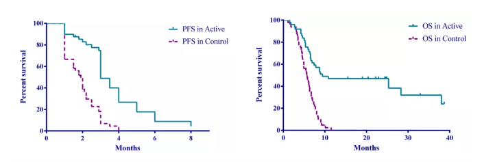 该II期临床研究共纳入97例IIIB-IV期非小细胞肺癌(NSCLC)患者,既往接受多种治疗方法,对化疗、靶向治疗、免疫治疗无反应或耐药。上述患者接受静脉输注大剂量VitC(1g/kg),与射频局部深部热疗(modulated electrohyperthermia,mEHT)同步治疗25次后,相比单纯最佳支持治疗组,显著改善其生活质量,能显著延长该类患者的无疾病进展生存期(PFS)与总生存期(OS)(PFS: 3个月 vs. 1.85个月; OS: 9.4个月vs. 5.6个月)(图1),3个月疾病控制率达42.9%(单纯最佳支持治疗组为16.7%)。