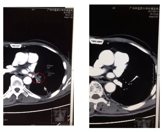 图4   左图:治疗前:肺门的肿大淋巴结(红色圈内);右图:治疗后,肿大的淋巴结消失