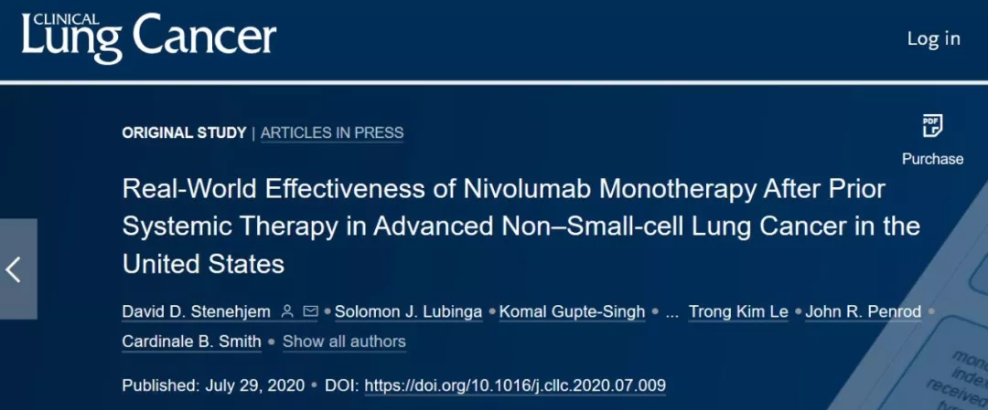 CheckMate-017/057/078研究奠定了Nivolumab单药后线治疗晚期NSCLC的地位,近期,来自美国的临床医生基于社区用药数据,分析了Nivolumab后线治疗晚期肺癌的疗效及安全性数据,结果于7月29日在线发表于最新一期的Clinical Lung Cancer杂志。