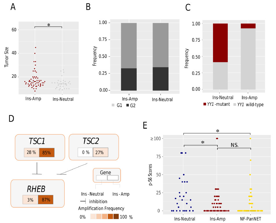 图2. 胰岛素瘤的分子亚型。(A)比较Ins中性与Ins-Amp的肿瘤直径。(B)比较Ins中性与Ins-Amp的组织学分级。(C)比较Ins中性和Ins-Amp的YY1突变率。(D) 与mTOR相关基因有关的早期扩增染色体上的扩增事件率。(E) Ins中性、Ins-Amp肿瘤和NF-panNETs的IHC p-S6评分。(F) 显示评分为80、40和0的IHC p-S6染色。*P<0.05。