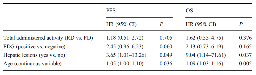43例患者(28例男性和15例女性)可评估,中位监测时间为118个月(12.6-139.6)。接受18.5GBq治疗的患者的中位PFS为59.8个月(95%置信区间[95%CI]14.3-79.6),与接受27.5GBq治疗的患者相同(59.8个月,95%CI为23.4-82.0)。18.5GBq治疗组的中位OS为71.0个月(95%CI为46.1-107.3),27.5GBq治疗组为97.6个月(95%CI为64.3-未达到)(P=0.22)。局限于淋巴结进展的患者的中位PFS和OS显著长于伴有肝脏病灶患者(PFS:P=0.02,OS:P=0.04)。PRRT治疗时年龄超过65岁对OS存在显著影响。值得注意的是,两组均未观察到晚期血液学或肾毒性。