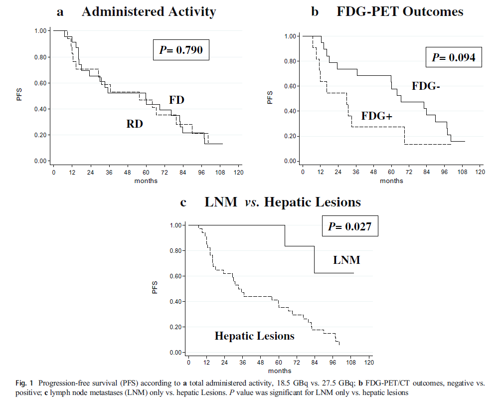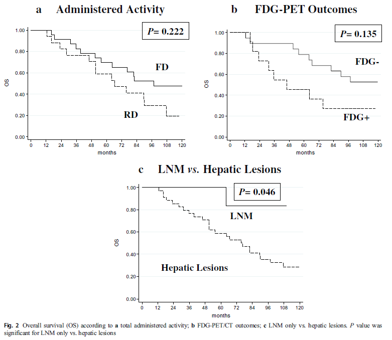 图5. 总生存期(OS):a. 整体给药活性,18.5 GBq vs 27.5 GBq;b. FDG-PET/CT结果,阴性vs阳性;c. 仅淋巴结转移(LNM)vs 肝病灶。仅LNM vs 肝病灶的P值具有显著性