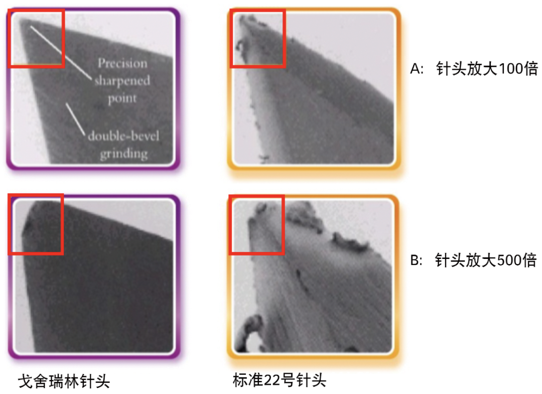 图3 戈舍瑞林针头锋利(对比标准22号针头,分别放大100和500倍仍锋利)