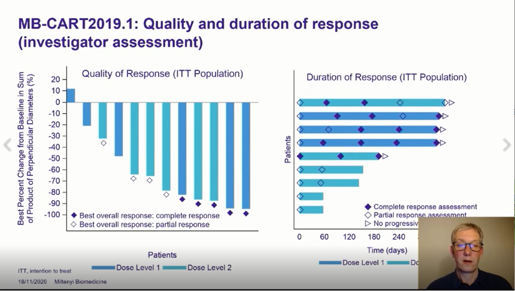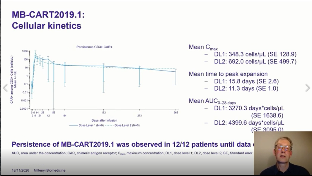 ②有效性方面:直到数据截止,在12/12患者中观察到MB-CART2019.1持续存在。9/12例患者(ORR 75%)对MB / CART2019.1治疗获得反应,其中获得CR病例数为5/12。在DL1队列中, 3/6患者中有反应(ORR 50%),在DL2 队列中,6/6患者中有反应(ORR 100%)。从药代动力学学显示T细胞水平的参数与临床之间有相关性。5/9患者持续获得反应,其中最长的反应持续时间为330天。