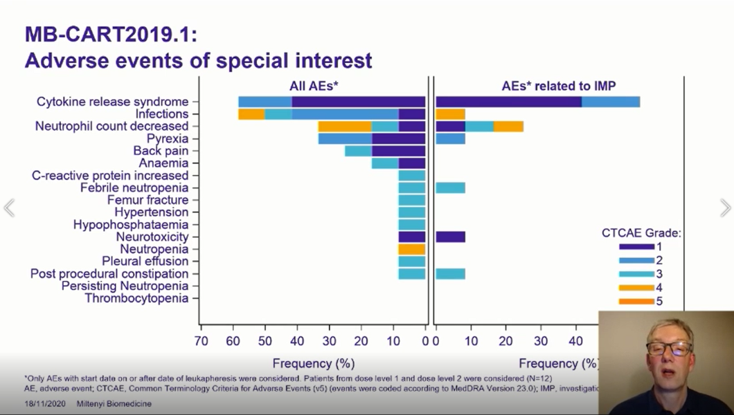 ①安全性方面:没有观察到DLT,也没有观察到细胞因子释放综合征(CRS)或神经毒性等级≥3。分别在DL1和DL2的3/6患者中发生CRS 1级,在DL2的2例患者中发生CRS 2级。1例患者接受了Tocilizumab的治疗。DL2的1名患者发生1级神经毒性。上述CRS和神经毒性完全消失。