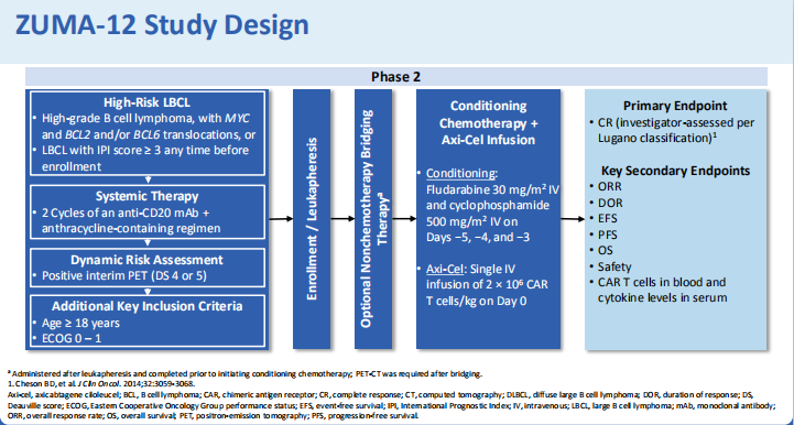 根据ZUMA-1结果来看,针对≥2线以上系统治疗后 R / R LBCL成人治疗效果显著。因此研究人员进行了ZUMA-12研究,旨在探究高风险LBCL的患者一线接受抗CD19嵌合抗原受体(CAR)T细胞疗法Axicel的疗效、安全性和药代动力学(PK)结果。