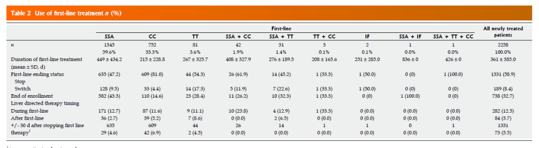 第一项研究[1],来自2个美国商业索赔数据库的数据,回顾分析了2009年~2014年,2258例患者中GI NET的现实治疗模式。本研究中药物治疗分为4组:SSA(生长抑素类似物)、TT(靶向)、CC(化疗)和IF(干扰素)。SSA包括奥曲肽和兰瑞肽,TT包括依维莫司和舒尼替尼,CC包括替莫唑胺、链脲佐菌素、多柔比星、氟尿嘧啶、卡培他滨、奥沙利铂等。肝局部治疗包括肝切除术、移植、病灶消融、栓塞和放疗。