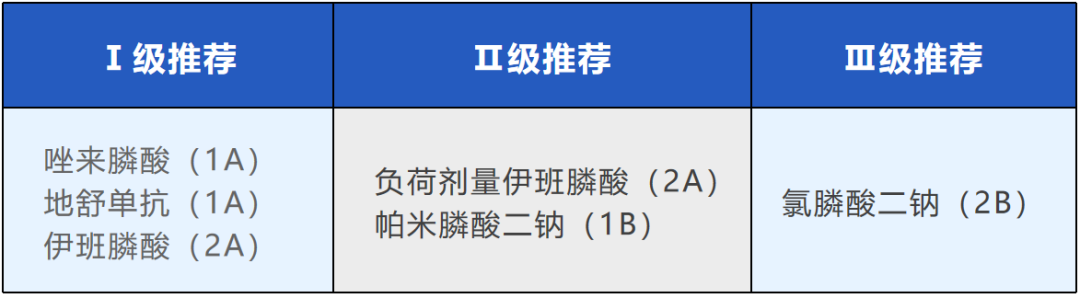在骨改良药物推荐中,除了有唑来膦酸、伊班膦酸等双膦酸盐以外,基于136研究提供的证据,RANKL抑制剂地舒单抗也作为Ⅰ级推荐(1A)。
