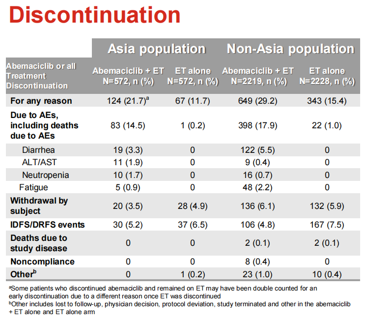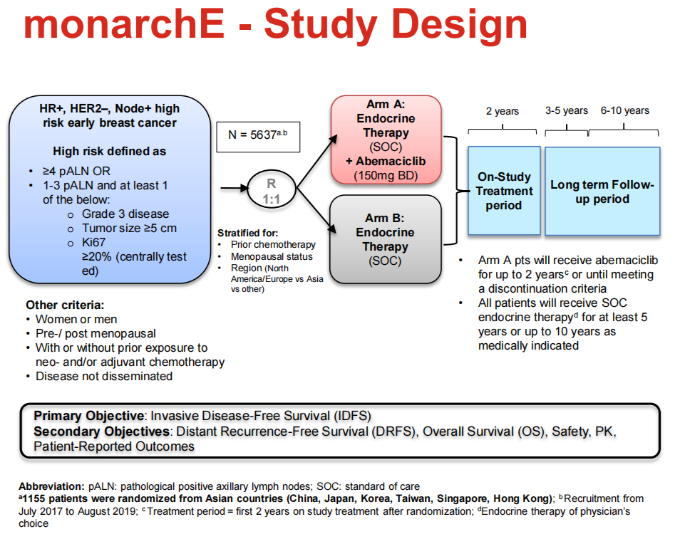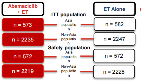 亚洲国家的乳腺癌患者与非亚洲国家的乳腺癌患者有不同的临床特征。既往monarch E研究数据显示,ITT人群中,阿贝西利联合内分泌治疗(ET)作为HR+/HER2-高危人群的辅助治疗,在早期乳腺癌无侵袭性疾病生存(iDFS)方面比单纯内分泌治疗有显著统计学意义的改善。