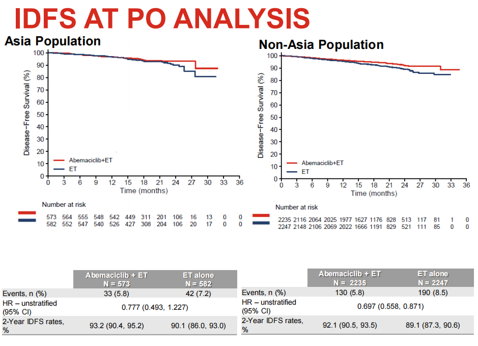 经过19个月的中位随访后(亚洲人群:阿贝西利联合内分泌治疗组为19.0个月,单纯内分泌治疗组为18.8个月,22.7%[n=262]患者完成了2年的治疗,非亚洲人群:阿贝西利联合内分泌治疗组为19.1个月,单纯内分泌治疗组为19.3个月。26.2%[n=1175]患者完成了2年的治疗),在亚洲人群中共观察到75例iDFS事件(阿贝西利联合内分泌治疗组为33个,单纯内分泌组为42个),与单纯内分泌治疗相比,阿贝西利联合内分泌治疗在数值上显示可以改善iDFS,可降低22.3%的浸润性疾病进展风险(HR=0.777,95% CI:0.493~1.227)。阿贝西利联合辅助内分泌治疗组和单纯内分泌治疗组2年iDFS率分别为93.2%和90.1%,2年iDFS率绝对获益3.1%。