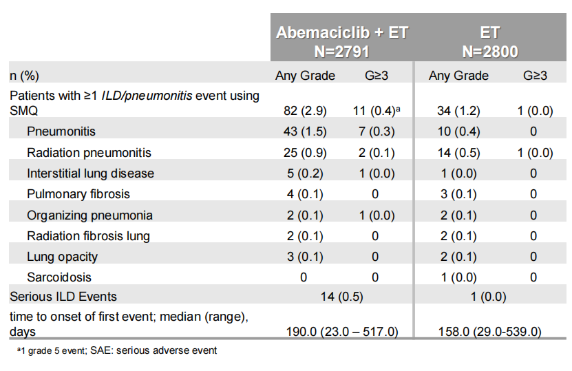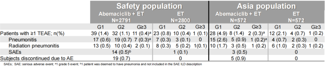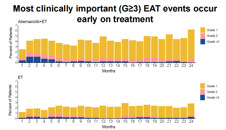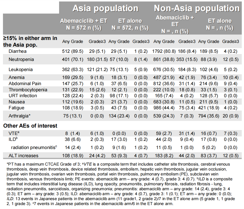 此次Monarch E研究安全性分析表明,HR+/HER2-早期高复发风险的乳腺癌患者中应用阿贝西利治疗所导致的VTE、EAT和ILD与既往阿贝西利的不良反应谱一致,可通过剂量的调整进行处理。虽然亚洲人群更易发生ILD,但是G≥3和停药率上与整体人群相似。多数发生上述AEs者可以继续阿贝西利的治疗。