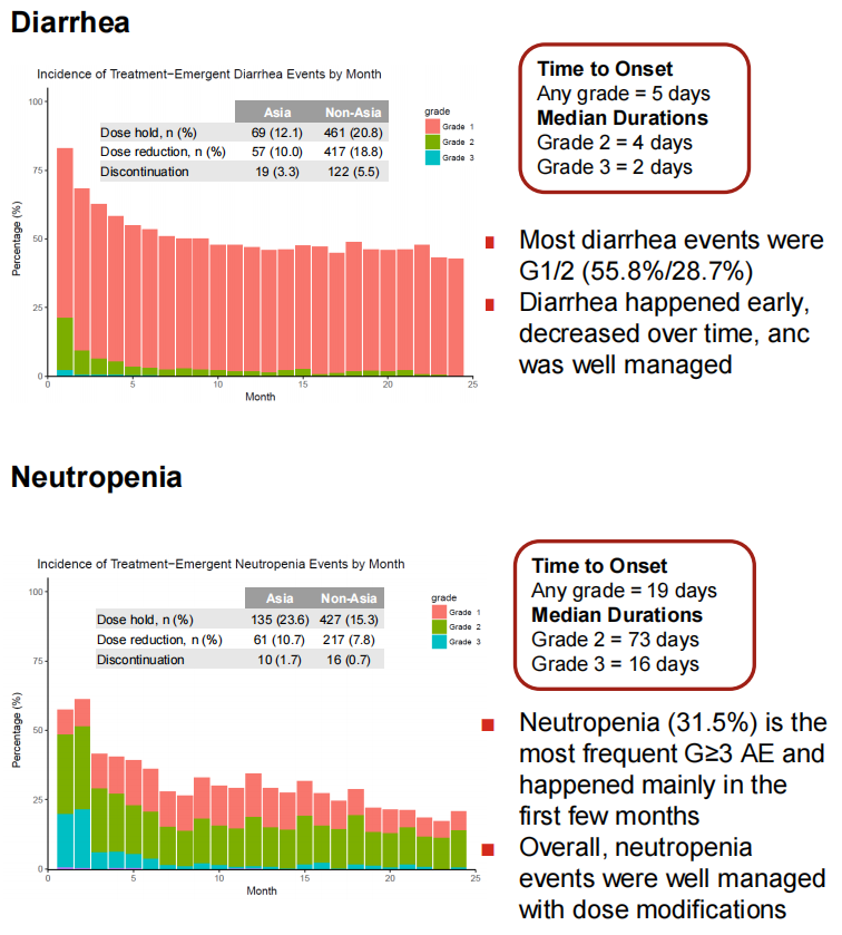 通过本次针对亚洲人群的数据分析我们可以看出,阿贝西利联合内分泌治疗也为亚洲患者带来了iDFS和DRFS的改善,这与在ITT人群中观察到的结果一致。在不良反应方面,我们可以看到该研究亚洲人群中腹泻为常见不良反应,但其腹泻发生级别小于3级,给予一定的药物可改善其症状,对患者的影响较小。虽然亚洲人群中由中性粒细胞减少和白细胞减少导致的停药率较高,但剂量调整后患者仍能够继续接受药物治疗,这也与ITT人群结果一致。