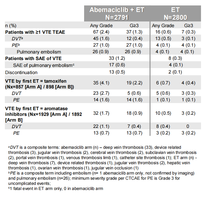 Monarch E研究应用阿贝西利±辅助内分泌治疗HR+/HER2-早期高复发风险的乳腺癌患者,此次Monarch E研究安全性分析共纳入了5591例患者,对3个临床重要不良事件(AEs):静脉血栓栓塞(VET)、肝功转氨酶升高(EAT)、间质性肺疾病(ILD)进行了探索。两组患者中位随访19.1个月,排除既往存在VET的患者;两个治疗组中VTE的风险因素(Khorana风险评分)和辅助放疗的比例(95.4%)匹配均衡。