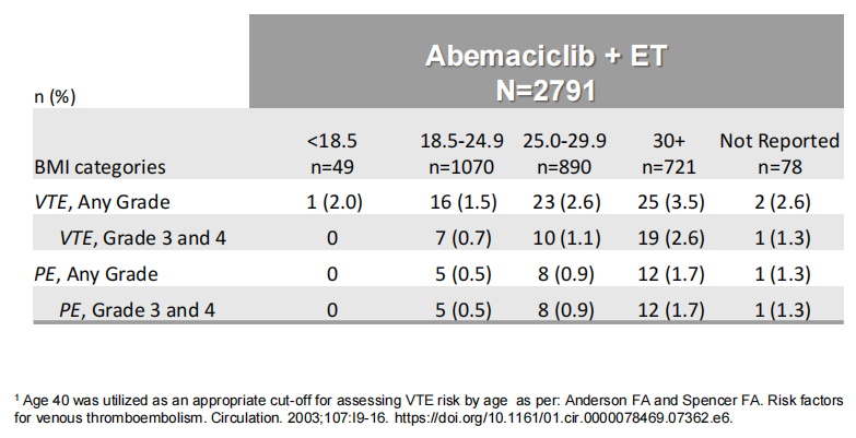 进一步分析发现阿贝西利治疗VTE患者与VTE/PE发生率及年龄增加无相关性。应用他莫昔芬治疗的患者更容易发生VTEs,随着BMI的增加,PE和3/4级VTE发生率有升高趋势。与体重指数(BMI)<25患者(0.6%)相比,BMI>25(1.8%)更易发生G≥3的VTEs。
