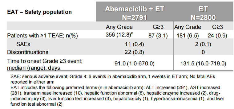 阿贝西利联合治疗组EAT发生率较高,85%的G≥3肝功转氨酶升高为单次发生,多在用药早期出现(阿贝西利联合治疗组和单纯内分泌治疗组的中位发病时间分别为3个月和4个月)。在发生G≥3肝功异常的患者中,71%的患者应用原剂量或减少剂量,16%的患者终止治疗。经剂量调整或阿贝西利停药时,所有G≥3的患者谷丙转氨酶的升高可逆,没有药物性肝损伤的发生。