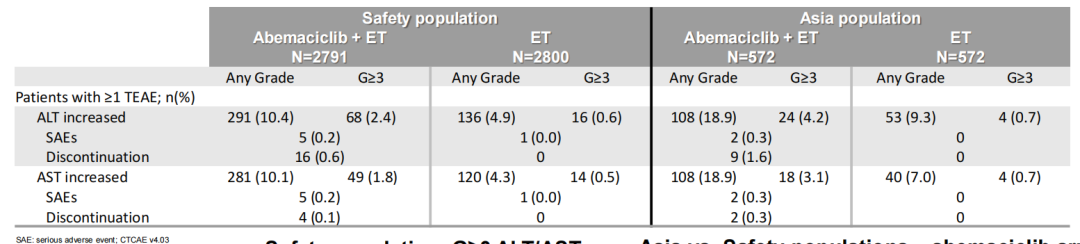 本次分析中,由于严重不良反应所导致的阿贝西利停药率为14.5%,在亚洲人群中,中性粒细胞减少和白细胞减少导致剂量保持和/或减少的发生率较高。在亚洲人群中大多数由AE引起的停药发生在治疗的前5个月内,大多数需要调整剂量的患者能够继续接受研究治疗。由于腹泻和疲劳引起的停药发生率较低,但由ALT、AST和中性粒细胞减少的停药率较高。