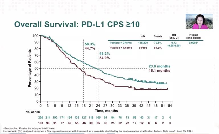 与安慰联合化疗相比,pembrolizumab+化疗一线治疗PD-L1阳性(CPS≥10)未经治疗的局部复发不可手术或转移性TNBC,可获得统计学和临床意义的OS显著改善。未发现新增的不良事件。