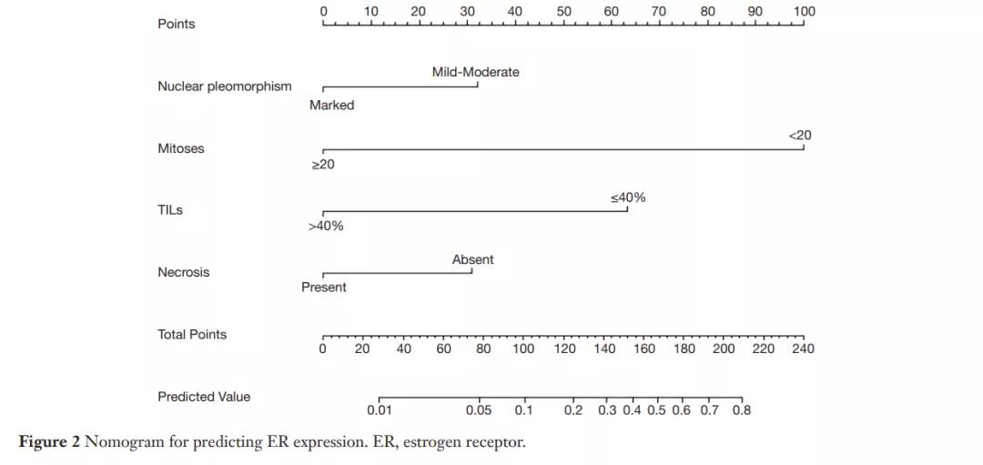 此外基于乳腺癌患者的临床病理特征开发的预测ER表达状态的诺模图对于ER弱阳性乳腺癌的精准治疗也同样具有指导意义。对多种临床病理特征进行多变量逻辑回归分析,结果显示与ER表达相关的独立因素包括核异型性(P=0.0339)、核分裂象(P=0.0022)、TILs(P<0.001)、以及坏死(P=0.0007)。以此建立的诺模图在预测概率和实际概率之间具有较好的一致性,AUC均高于0.80,具有良好的预测精度;通过计算约登指数得出该模型预测ER表达状态的cut-off值为0.59。