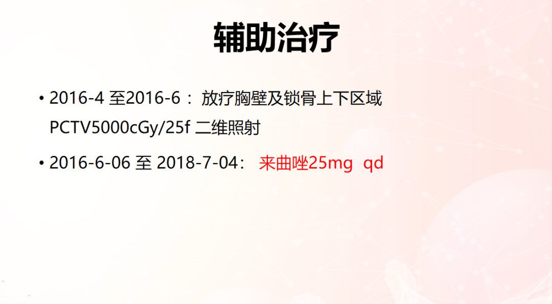 王涛教授:该患者转移前ER、PR均为强阳性,HER2阴性,转移后也为ER强阳性,按照当前的指南和规范,大家都会推荐患者使用CDK4/6抑制剂联合内分泌治疗的方案,因为患者目前没有内脏危象,仅有软组织转移,既往内分泌治疗敏感(来曲唑治疗两年后复发)。但患者复发转移时间在2018年,考虑当时CDK4/6抑制剂在我国不可及,基于这个原因,我也会考虑内分泌治疗,在当时环境下,有mTOR抑制剂可选择,如果患者由于经济原因或其他因素不可用,我也会推荐患者单用内分泌治疗(考虑SERD药物氟维司群)。