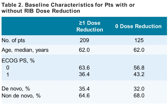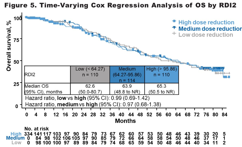 两个时间相关变量包括剂量减少(RIB 600 mg起始剂量,有/无剂量调整)和相对剂量强度2(RDI2)作为协变量包含在各自模型中,来探索对OS的影响。考虑到第一次给药的时间差异,RDI2反映了剂量调整后与OS的相关性,使用改良的Kaplan-Meier方法获得中位OS(mOS)数据。