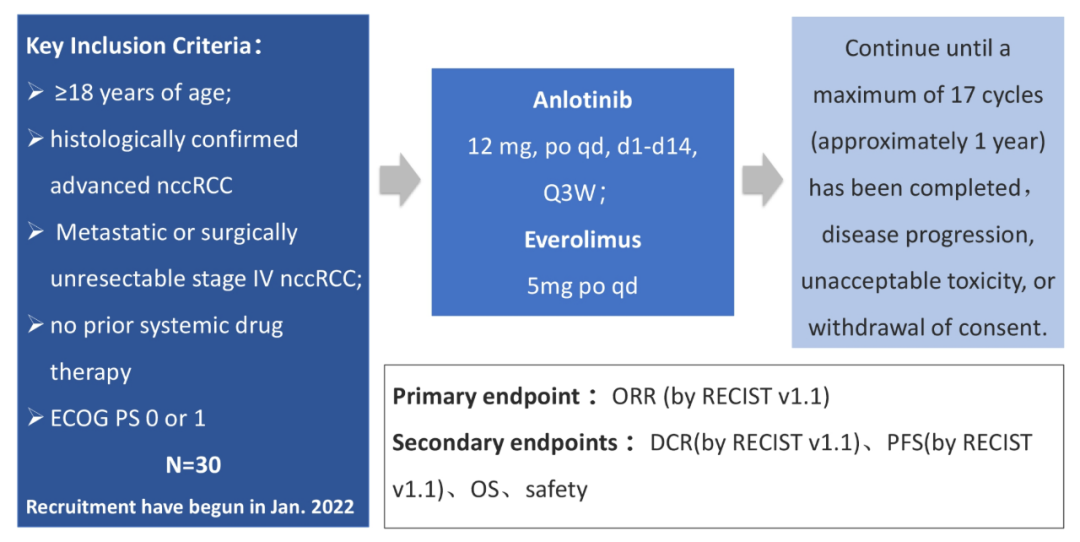 在本次2022年美国临床肿瘤学会(ASCO)年会上,由复旦大学附属肿瘤医院副院长、上海泌尿肿瘤研究所所长叶定伟教授牵头发起的ALTER-UC-001研究入选大会壁报交流。该研究是一项安罗替尼联合依维莫司作为晚期非透明细胞肾细胞癌一线治疗的Ⅱ期试验。主要入组标准为:年龄≥18岁;组织学证实的晚期nccRCC;既往未接受过针对晚期疾病的全身性药物治疗;ECOG评分0-1。计划入组30例患者接受安罗替尼联合依维莫司治疗,持续至多1年(~17个周期)或直到疾病进展、不可耐受的毒性或撤回知情同意。主要终点是ORR,次要终点包括疾病控制率(DCR)、PFS、OS、安全性。