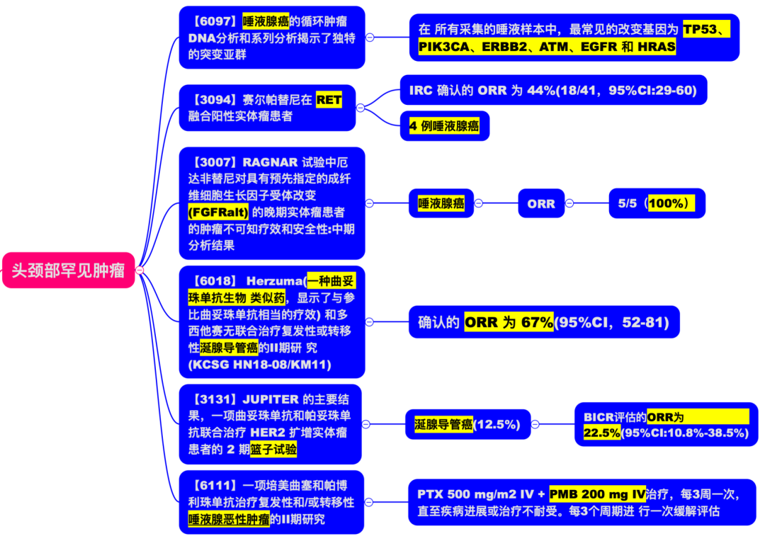 一项对222例唾液腺癌患者的唾液样本进行ctDNA和基因检测的分析显示,最常见的突变基因为TP53、PIK3CA、ERBB2、ATM、EGFR、HRAS,提示唾液腺癌患者可能从这些靶点药物的治疗中获益。其他几项临床试验初步验证了这一猜想,例如:1/2期LIBRETTO-001研究中,RET抑制剂selpercatinib用于RET融合阳性实体瘤的ORR为44%,其中有4例为唾液腺癌;2期RANGAR研究中,FGFR-TKI厄达替尼用于5例携带FGFR改变(FGFRalt)的唾液腺癌患者,ORR为100%;2期KCSG HN18-08/KM11研究中,曲妥珠单抗生物类似药Herzuma联合新型多西他赛Nanoxel治疗复发或转移性涎腺导管癌的ORR为67%;2期篮子试验JUPITER中,曲妥珠单抗联合帕妥珠单抗用于HER2扩增实体瘤(其中12.3%为涎腺导管癌)的ORR为22.5%;此外,一项帕博利珠单抗联合培美曲塞治疗复发或转移性唾液腺恶性肿瘤的2期研究正在进行中,期待相关研究结果的报道。