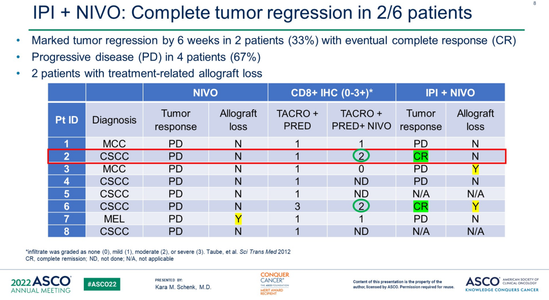[23]Kara M.Schenk,et al.Nivolumab(NIVO)+tacrolimus(TACRO)+prednisone(PRED)+/-ipilimumab(IPI)for kidney transplant recipients(KTR)with advanced cutaneous cancers.ASCO 2022,abstr 9507