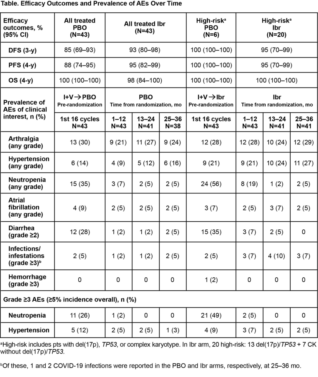 共164例患者接受Ibr+Ven联合治疗,治疗完成后86例证实为uMRD,随机分入PBO组或单药Ibr治疗组(每组n=43)。既往报告过基线特征(Wierda et al.J Clin Oncol.2021;39:3853)。证实为uMRD患者的中位研究时间56个月(Ibr组25-68个月;PBO组40-65个月),PBO组和Ibr组中位随机后随访时间分别为41.2个月和41.5个月。PBO组中,63%患者CR为最佳反应(随机后随访2年时60%),Ibr治疗组中,81%患者CR为最佳反应(随机后随访2年时72%)。随机后2年至3年,uMRD率保持稳定(PBO为56%[n=24]和58%[n=25];Ibr为60%[n=26]和63%[n=27])。PBO组患者的3年DFS率85%(95%CI,69-93),Ibr组患者93%(95%CI,80-98)(P=0.1621);4年OS率分别为100%(n=0死亡)和98%(95%CI,84-100)。应注意,高危亚组患者的疗效与总人群一致,但PBO组样本量较低,结果解释应谨慎(表)。随机分组后,二组的AEs率总体稳定(表)。随机后1-3年,PBO组新发高血压发生率低于Ibr组(1年n=1/43和n=3/43;2年n=1/41和n=4/41;3年n=3/38和n=2/41)。随机后3年,PBO组未发生新的房颤或≥3级出血事件,Ibr组1例患者随机后第2年发生房颤。随机后第3年,与预期一致,PBO组无患者因AE而剂量减少或停药,Ibr组1/41例患者因AE减量,2/41例患者因AE停止治疗。PBO和Ibr组分别有7和2例患者疾病进展,PBO组的4/7例患者进行了后续治疗(3例Ibr,1例其他药物),Ibr组0例患者后续治疗。