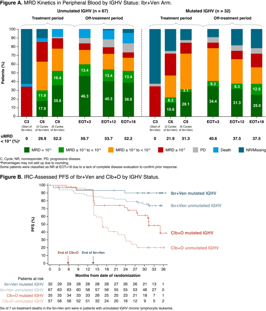 中位随访34.1个月,Ibr+Ven组无论IGHV状态,治疗后PFS率均可较好维持,而Clb+O组的uIGHV患者更早复发(图B)。更长随访后的PFS、总生存和亚组分析将在后期报告。