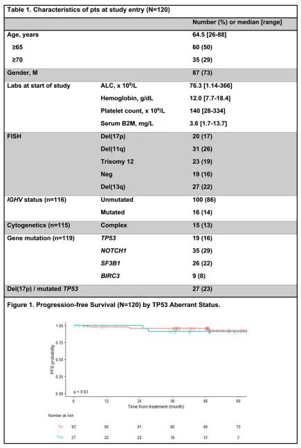 4年PFS为94.5%(95%CI,90.3%-98.9%),4年OS为96.6%(95%CI,93.3%-99.9%)。TP53异常和正常CLL的4年PFS如图1所示,del(17p)/TP53突变(n=27)患者的4年PFS为90.9%,无del(17p)/TP5突变(n=93)患者95.5%。上述患者/疾病特征均与PFS无关。