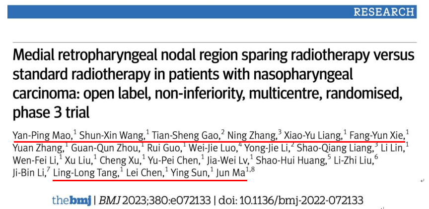 该项研究于英国当地时间2023年2月6日在线发表于国际顶级医学期刊《英国医学杂志》(The British Medical Journal,BMJ)。马骏教授、孙颖教授、陈磊主任医师、唐玲珑主任医师为共同通讯作者,毛燕萍主任医师、王顺鑫硕士、高天生主任医师(梧州市红十字会医院)、张宁主任医师(佛山市第一人民医院)、梁晓雨医师、谢方云教授为共同第一作者。同时,这项研究作为10%以内的优秀论文入选了2022美国放射肿瘤学会(ASTRO)年会口头报告。