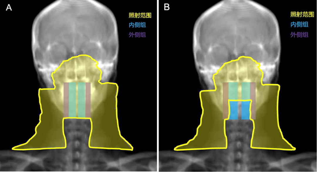 A对照组:内、外侧组咽后淋巴结区均接受预防照射(左)