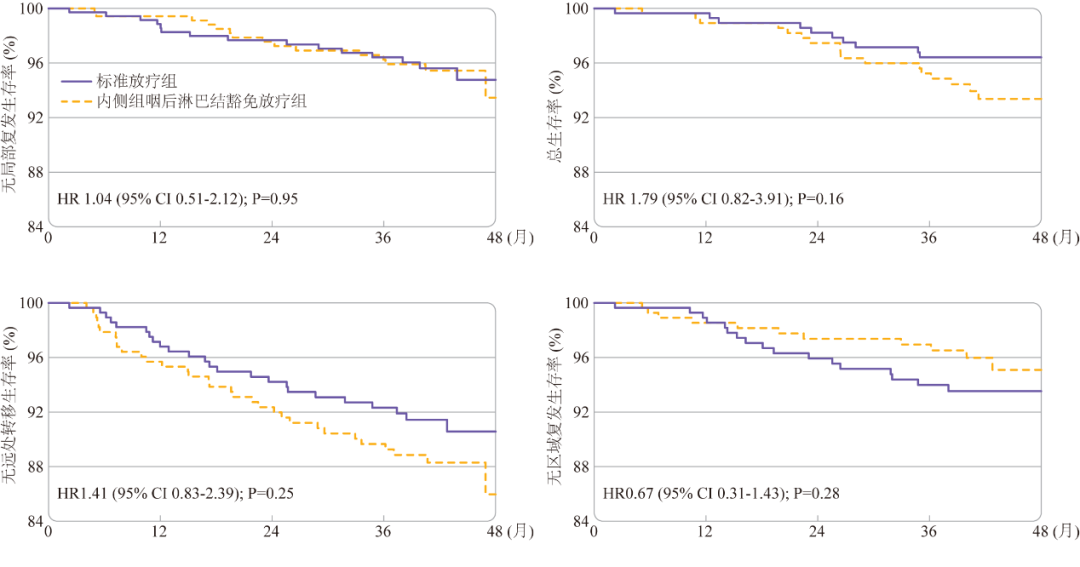 结果显示,在鼻咽癌患者中,3年无局部复发生存率在内侧组咽后淋巴结区豁免放疗组和标准放疗组相似(95.3%对95.5%,差值-0.2%,非劣效P值<0.001)。同样,3年总生存率(95.2%对96.4%,P=0.16),无区域复发生存率(96.9%对94.0%,P=0.28),无远处转移生存率(89.7%对92.3%,P=0.25)在两组间均相似。