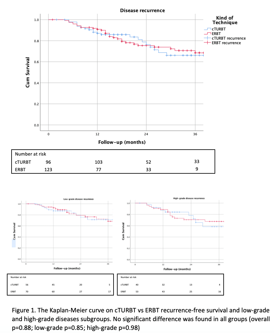 在ERBT组中,低分化(LG)、高分化(HG)和CIS的患者分别有70例(56.9%)、49例(39.8%)和4例(3.3%)患者的肿瘤为低分化(LG)、高分化(HG)和CIS,cTURBT组则分别有56例(58.3%)、37例(38.5%)和3例(3.1%)。共有201例患者达到了1年的随访治疗。未复发患者的中位随访时间为19个月(IQR 14-35)。ERBT组和cTURBT组分别有11例(8.9%;5例LG;6例HG)和12例(12.5%;5例LG;6例HG)发生1年复发。中位复发时间为14个月(IQR 8-22)。KM曲线显示,两组之间的无复发生存期相似,LG和HG也相似(P=0.88,0.85-0.98)。