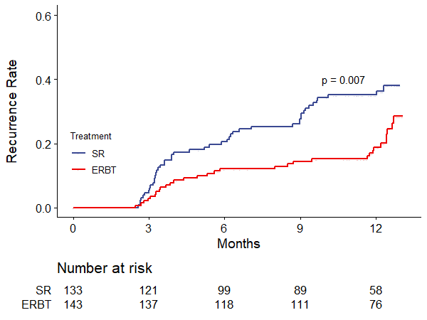 本研究结果表明,在肿瘤≤3厘米的NMIBC患者中,与SR相比,接受ERBT的患者1年复发率明显更低。