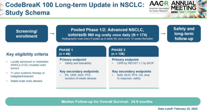 2022年AACR年会期间提交的1/2期CodeBreaK 100试验(NCT03600883)的最新数据显示,根据长期随访,Sotorasib在KRAS G12C突变的非小细胞肺癌(NSCLC)患者中显示出非常有意义和持久的疗效,2年总生存(OS)率令人印象深刻。