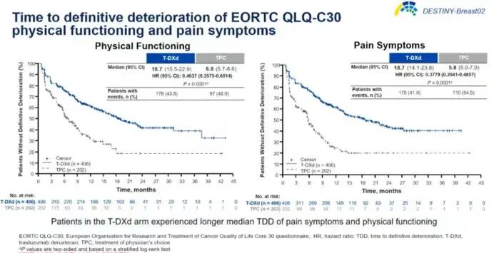 该研究结果表明了与医生选择的化疗(TPC)相比,T-DXd能为患者带来了更好的生活质量,且接受T-DXd治疗的患者生活质量至明确恶化时间也被延缓了。更具体来讲,T-DXd组的患者总体健康状况、整体生活质量、身体机能和疼痛症状方面至明确恶化的时间要比医生选择化疗的患者晚。DESTINY-Breast02研究和患者报告结局数据验证了T-DXd对T-DM1耐药且HER2阳性的转移性乳腺癌患者的获益。