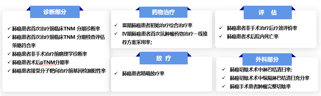具体到肿瘤专业医疗质量控制指标,肺癌部分共包括13项质量控制指标,涵盖了诊断部分、外科部分、药物治疗、放疗等全病程管理的各个环节,为临床规范化诊断、用药和患者管理提供指导。诊断部分包括指标一(肺癌患者首次治疗前临床 TNM 分期诊断率)、指标二(肺癌患者首次治疗前临床 TNM 分期检查评估策略符合率)、指标三(肺癌患者非手术治疗前病理学诊断率)、指标四(肺癌患者术后病理 TNM 分期率)、指标十(肺癌患者接受分子靶向治疗前基因检测阳性率)。药物治疗部分包括指标七(Ⅲ期肺癌患者初始治疗综合治疗率)、指标九(Ⅳ期肺癌患者首次抗肿瘤药物治疗一线推荐方案采用率)。放疗部分包括指标八(肺癌患者精确放疗率)。外科部分包括指标五(肺癌切除术术中淋巴结清扫率)、指标六(肺癌切除术术中纵隔淋巴结清扫充分率)、指标十二(肺癌手术患者肿瘤完整切除(R0)率)。指标十一(肺癌患者非手术治疗后疗效评价率)和指标十三(肺癌患者术后院内死亡率)是用于疗效评估的指标。