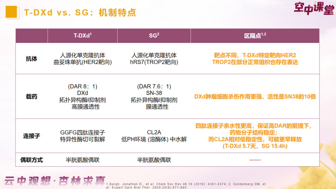 在药物机制方面,T-DXd和SG存在一定差异,包括:(1)抗体的靶点不同,T-DXd特定靶向的HER2往往是乳腺癌的驱动基因,而TROP2在部分正常组织也存在表达。(2)T-DXd的载药DXd具有更强的肿瘤细胞杀伤作用,其活性是SG载药SN-38的10倍。(3)T-DXd的四肽连接子亲水性更高,保证高DAR的前提下,药物分子结构稳定;而CL2A连接子可能更早释放(T-DXd约为5.7天,SG约为15.4小时)[20]。
