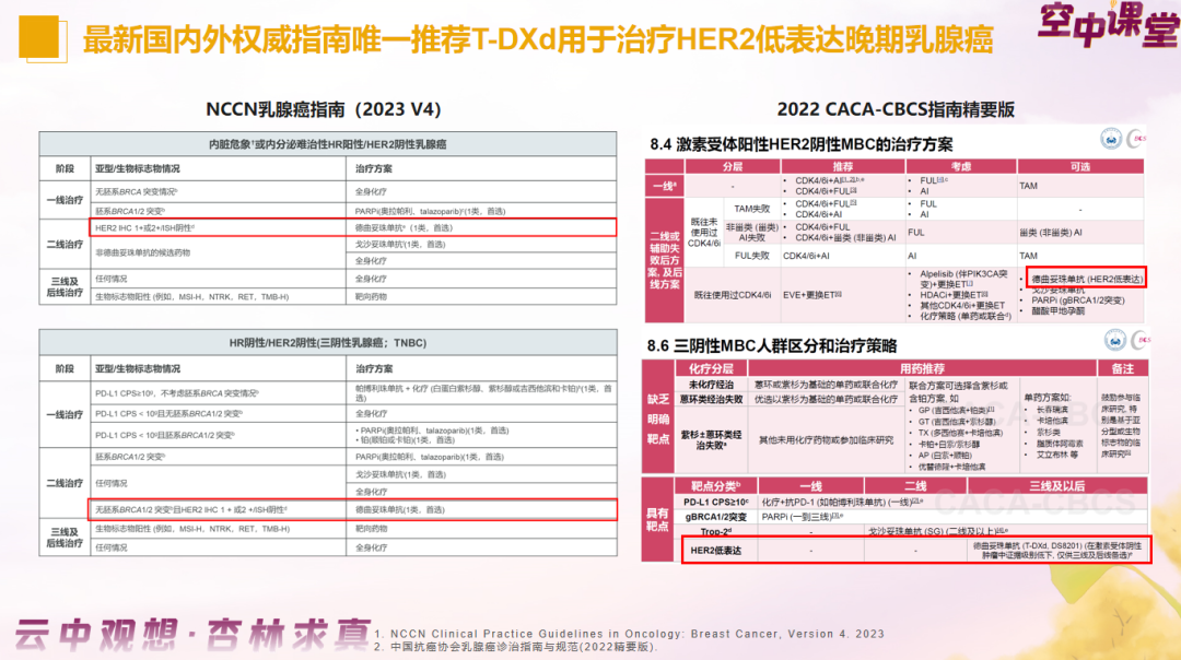 目前,在NCCN(2023.V4)指南中,T-DXd二线治疗HER2低表达患者为I类证据,其中T-DXd被推荐用于HR阳性内脏危象或内分泌难治性患者二线治疗,不适用T-DXd者可选择SG;在晚期TNBC治疗推荐中,T-DXd主要用于HER2低表达患者、而SG可用于任意患者的二线治疗[21]。在2022版CACA-CBCS指南中,SG和T-DXd是CDK4/6i经治患者的可选方案,T-DXd是唯一被推荐用于治疗HER2低表达(HR+和HR-)患者三线及以后的抗HER2治疗方案[2]。