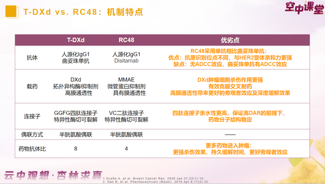 尽管RC48在治疗HER2低表达mBC中展现了积极的抗肿瘤活性,但其与T-DXd在药物机制方面有一定差异:(1)T-DXd的抗体部分曲妥珠单抗保留了与裸抗相似的HER2结合亲和力,而且具有ADCC效应;而RC48抗体部分Hertuzmab与HER2亲和力更强,但没有很好的ADCC效应[27-28]。(2)T-DXd的DAR是RC48的两倍,高DAR能在更广泛的HER2表达水平,尤其是HER2低表达、超低表达肿瘤中仍具有抗肿瘤效果,有研究显示在HER2弱阳性细胞系中,DAR=8的ADC表现出相较于DAR=3.4的ADC所不具有的抗肿瘤作用[29]。(3)T-DXd的载药DXd具有更强的肿瘤细胞杀伤作用,并且可以克服乳腺癌常见化疗药物的交叉耐药,其高膜通透性带来更好的旁观者效应及更优的疗效。(4)二者连接子均可裂解,在稳定性和均一性前提下,DAR越高的ADC疗效越好,T-DXd四肽连接子亲水性更高,保证高DAR的前提下,药物分子结构稳定[30-31]。