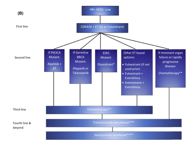 随着T-DXd在DB04试验中对所有HR+患者(包括HR阴性)有效,并被批准用于HER2低表达乳腺癌,无论HR状态如何。然而,该批准提出了一个关于T-DXd与其他标准治疗的最佳排序策略的问题。今年5月发表在Cancer上的一项研究对此进行了探讨。研究者利用目前文献中的证据,分别对T-DXd与戈沙妥珠单抗(sacituzumab govitecan,SG)、alpelisib、依维莫司(everolimus)、多聚ADP核糖聚合酶(PARP)抑制剂等其他当前疗法的结局进行讨论,以指导HR+和HR-/HER2低表达转移性乳腺癌的最佳治疗排序策略(如下图)[4]。研究主要发现有: